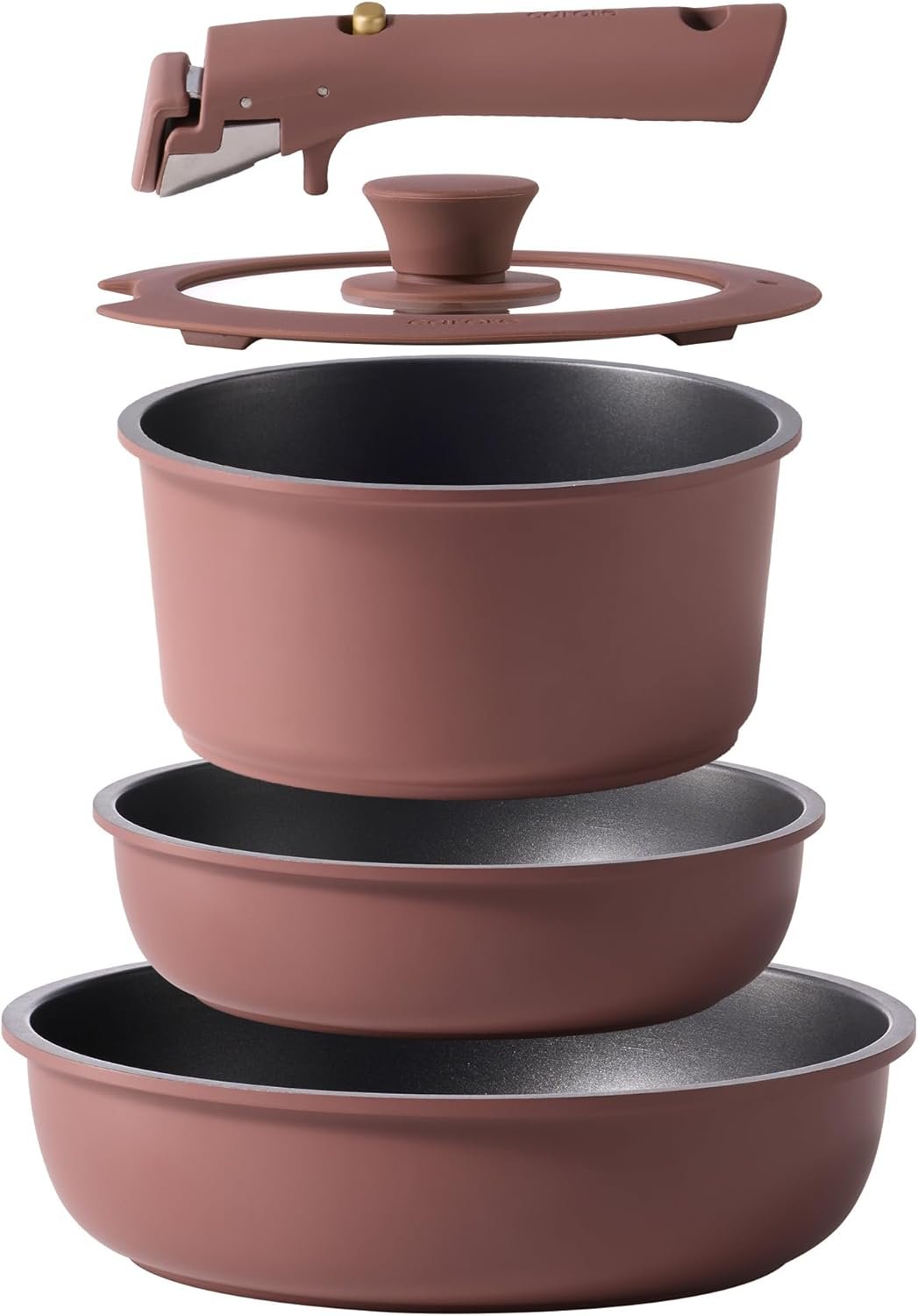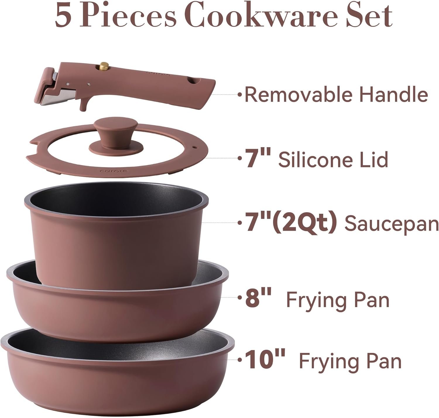 Upgrade your kitchen with the CAROTE 5-Piece Non-Stick Cookware Set, designed for smart, space-saving, and versatile cooking. Featuring a rich burgundy finish and a detachable handle system, this set easily moves from stovetop to oven to table — and stores neatly in small kitchens, apartments, or RVs. The premium non-stick coating ensures effortless cooking and quick cleanup, while the PFOA & PFOS-free surface keeps your meals safer and healthier.